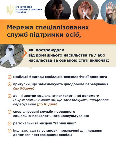 - Урядова “гаряча лінія” для осіб, постраждалих від торгівлі людьми, домашнього насильства, насильства за ознакою статі, насильства стосовно дітей, або про загрозу вчинення такого насильства: 15-47